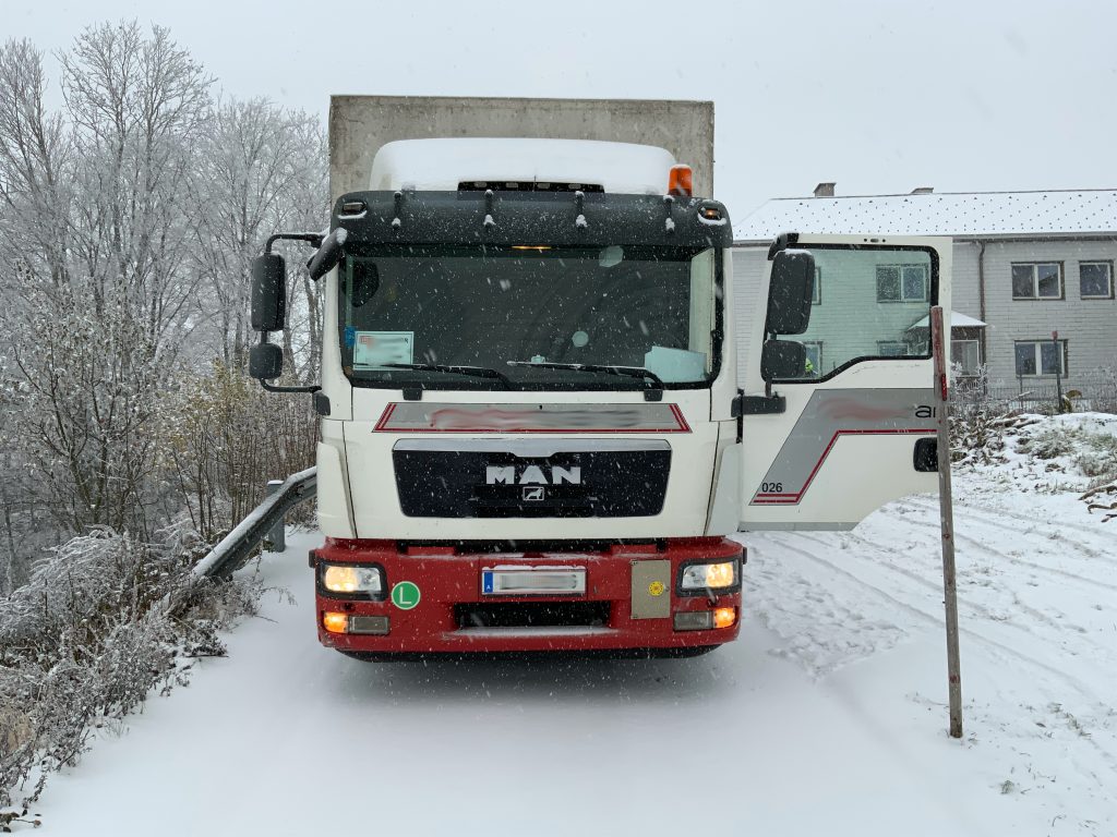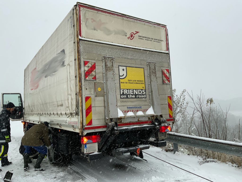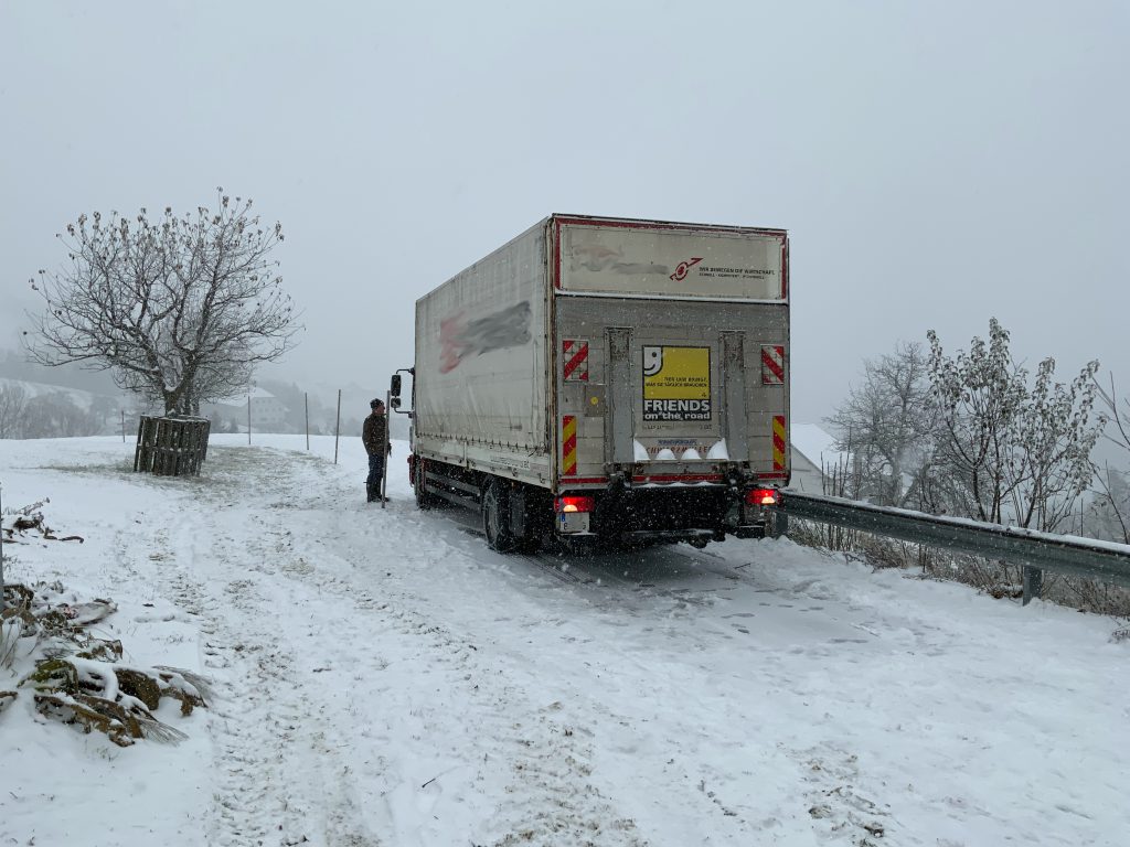 Der Fahrer eines Lieferfahrzeuges konnte aufgrund des starken Schneefalls und glatter Straße auf der abschüssigen Fahrbahn nicht mehr weiterfahren.